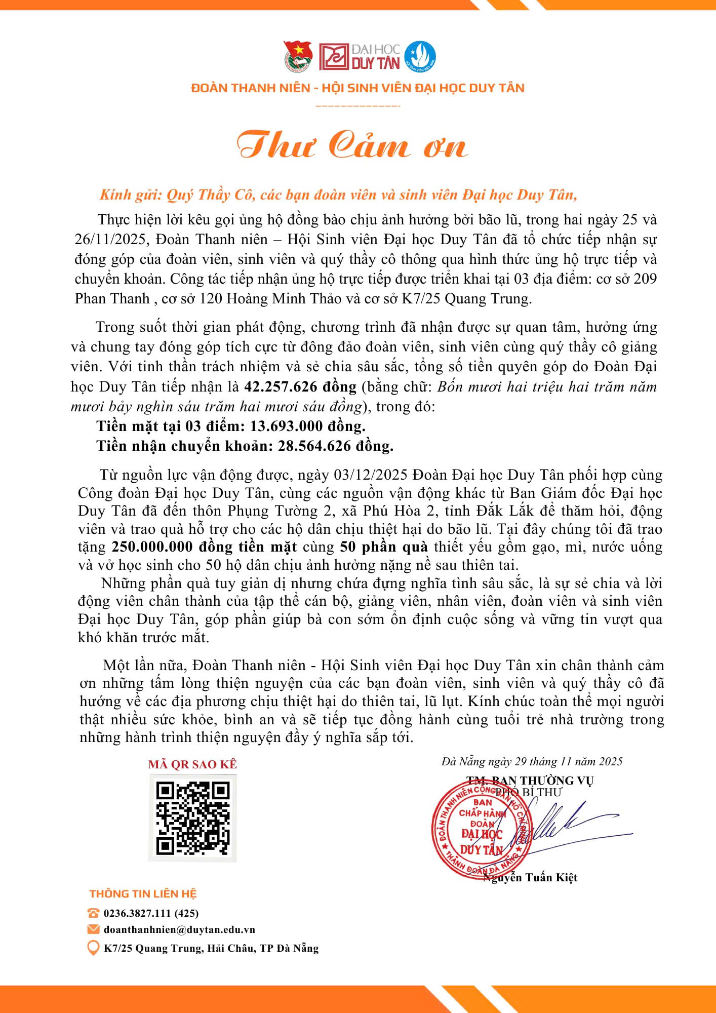 Thư cảm ơn của Đoàn Thanh niên – Hội Sinh viên Đại học Duy Tân về công tác hỗ trợ đồng bào vùng lũ